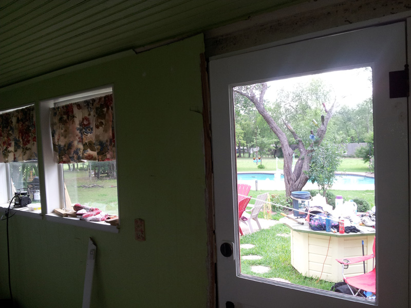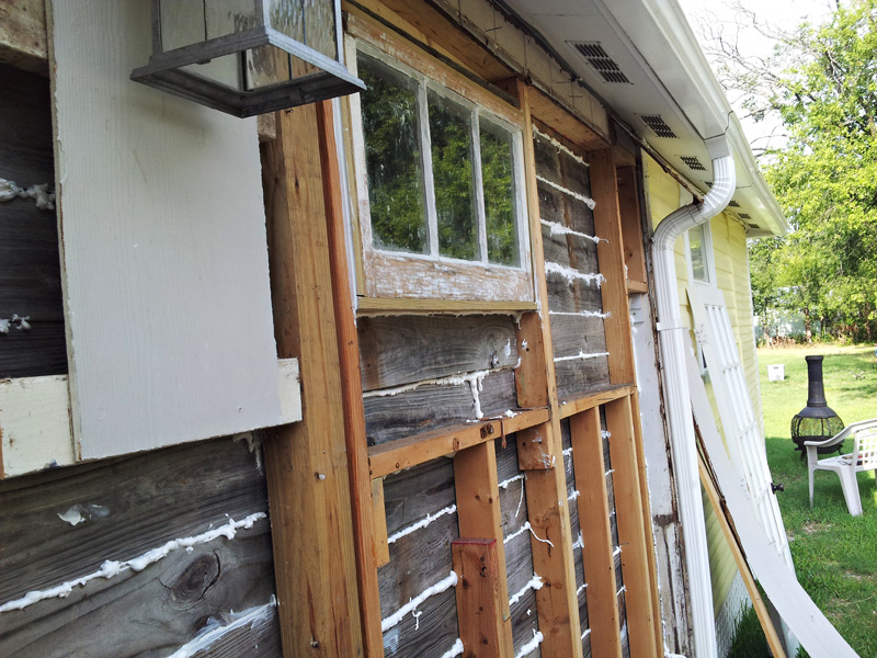 During this time it rained some. I was in a hurry to put up the house wrap and I accidentally stapled a staple into one of the window panes. I was very upset.